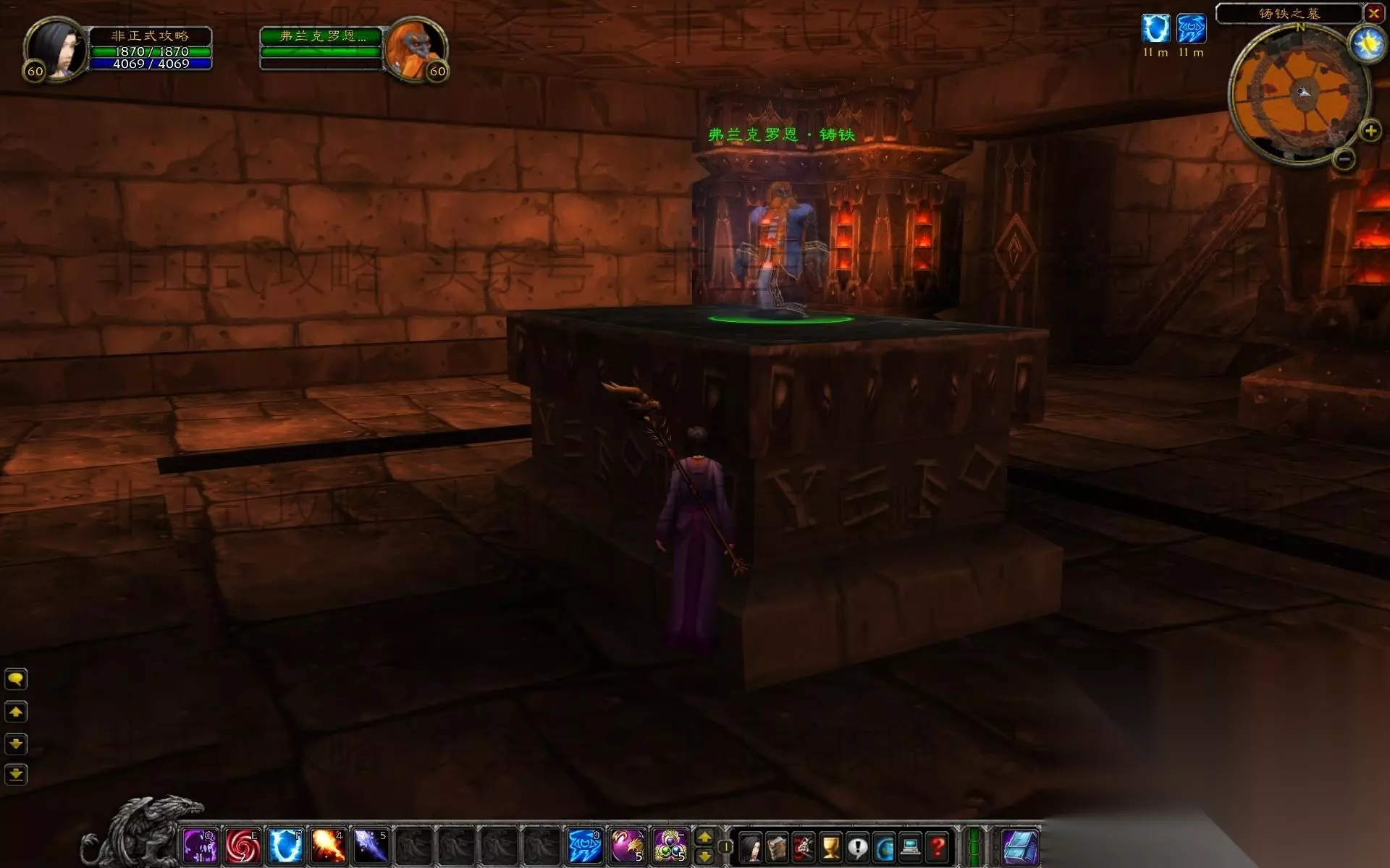 1、接任务 如图,进黑石山之后,沿着大锁链走到中央石柱里面的房间,这里就是接任务的地方,请务必在灵魂模式下到达这里!也是说进本之前先自杀(建议直接跳MC门口附近岩浆),然后灵魂状态跑到这里,你就能看到NPC弗兰克罗恩·铸铁,和他对话接到任务“黑铁的遗产”。 任务要求:杀掉弗诺斯·达克维尔并拿回战锤铁胆。把铁胆之锤拿到索瑞森神殿去,将其放在弗兰克罗恩·铸铁的雕像上。 你可以在律法之环外的工匠大厅里找到弗诺斯·达克维尔。 杀掉那个卑鄙的家伙,拿回我的铁胆之锤。 把铁胆之锤拿到索瑞森神殿去,然后把它放在正确的地方--就是我的雕像的手里。 当你把铁胆之锤放上去之后,我存放主宰钥匙的那个小机关将会打开。更重要的是,铁胆之锤将会永远掌握在我的手中。如果有人想要拿走战锤的话,那整座雕像和战锤都会碎裂,永远无法修复。 任务奖励: 暗炉钥匙×1