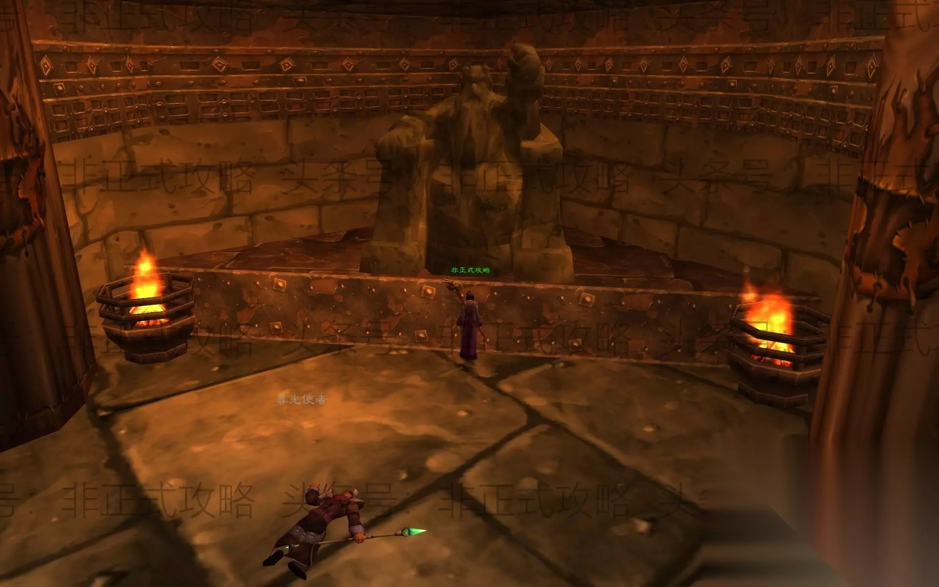 图二 上来之后清右手边的怪,不走那个下坡楼梯,拐弯直行,到达一个大窗户前,往下眺望能看到有怪在这来回巡逻。掌握好位置跳下去,小心靠边走到火元素那边,击杀两边的火元素,一直清怪往前,就能看到有一个黑铁毡(后期的黑铁装备都需要来这里制作),一个带名字的火元素BOSS。记住这里!下回我们做MC门任务的时候也是来这里。杀完这只火元素BOSS,继续往前行走,来到一群庞大石元素的房间,这里就是任务说的工匠大厅。