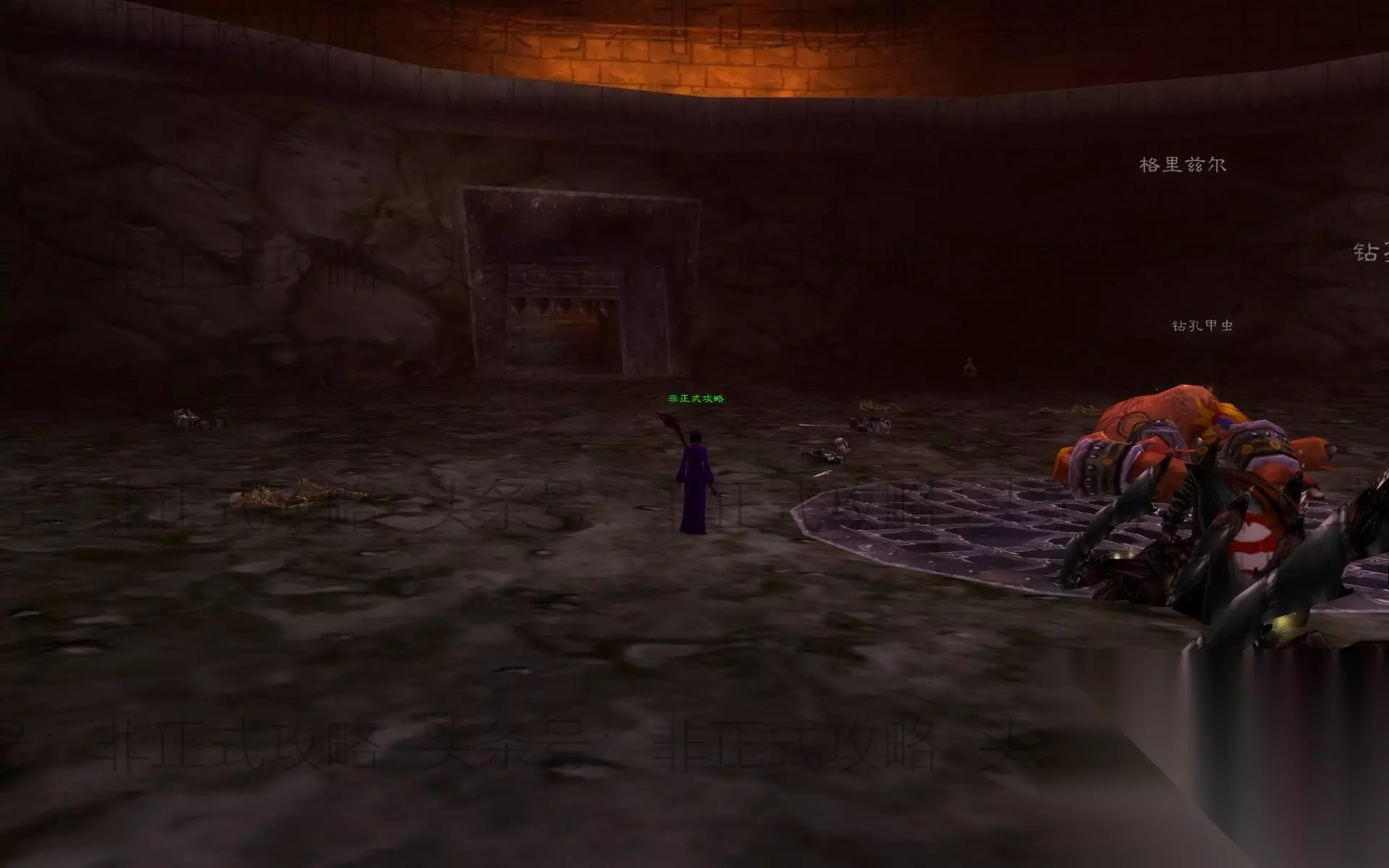 工匠大厅 沿着路一直往前清怪,来到一个坡上看到任务怪弗诺斯·达克维尔。杀之掉落“铁胆之锤”。拾取后继续往前走,来到一扇门。从这个门走出去,来到一个比较宽阔的平台,记得后来版本有一个矮人的钻探机钻出来后就是这个地方。平台前面有两个大门,我选择了最前面的那个门进去。