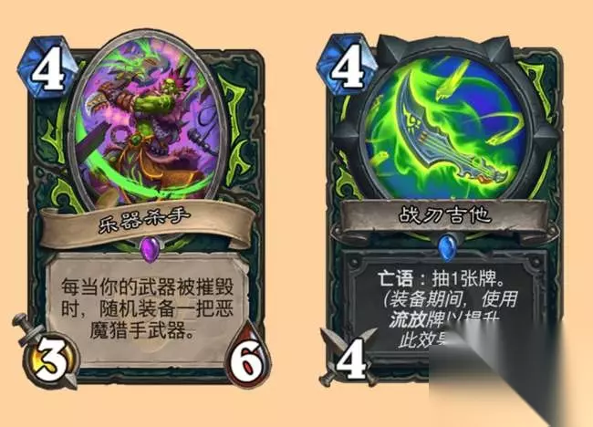 恶魔猎手新版本其中一个流派似乎会和武器有关,乐器武器战刃吉他亡语可以抽牌,而在装备期间使用流放牌会让抽牌变多,本身模型也不错,就算没有升级也是很强的武器。而乐器杀手则能够让你在武器被摧毁的时候随机装备一把恶魔猎手武器。清风看了一下目前还在标准环境里的恶魔猎手武器,只有一把1费1/2的灾难之握比较一般,其他都挺强的,即便是灾难之握,亡语也会给流放牌,还挺适合战刃吉他,总体来看是一张不错的单卡,天梯有机会进构筑,竞技场里也很强。