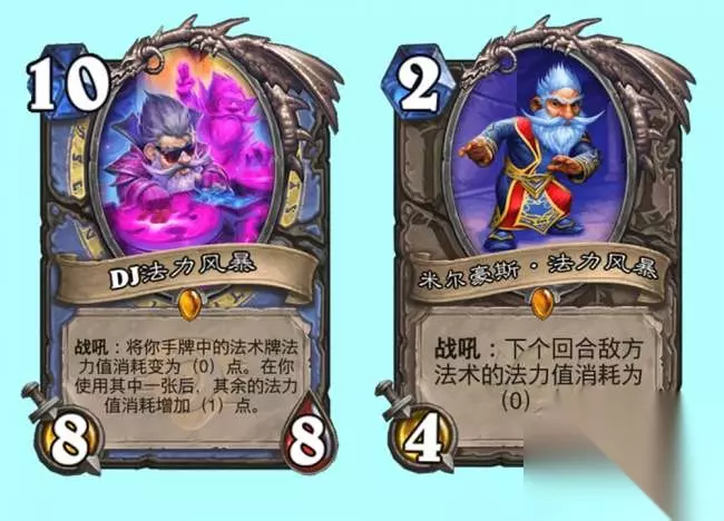 DJ法力风暴是一张高达10费的橙卡,米尔豪斯·法力风暴终于完成了他登场台词里的威胁:”你等着,等到我有十点法力值的时候。”顺带一提,当年米尔豪斯有这个威胁是因为他最初版本效果是战吼给一张10费的法术,效果是对所有敌人造成5点伤害,后来才被改成现在逗比橙的模样。这次出了一张10费的法力风暴,不知道语音会不会cue一下最初的登场台词呢?