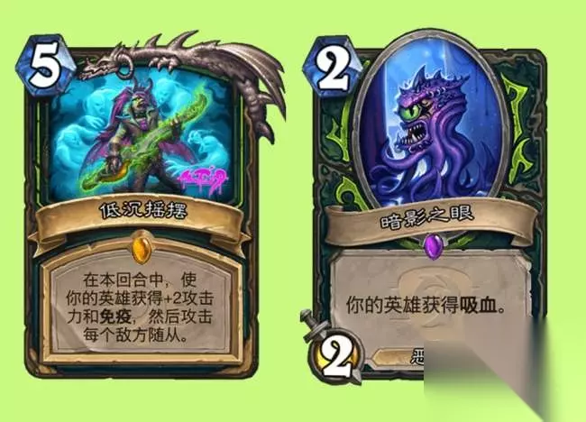 恶魔猎手的橙法低沉摇摆,释放后会让英雄获得+2攻击力和免疫,并且攻击每个敌方随从,如果单独使用的话效果就有点像奉献,但可以配合武器增加攻击力,或者配合另一张新卡暗影之眼来回血,不过根据设计师蓝贴解释,在攻击过程中,武器耐久值变0就会摧毁,并不是像评论区说的那样会变负数,现在看最好的配合也就是提前挂蛋刀,然后下回合用两张加攻击力的0费法术,配合低沉摇滚获得四次额外攻击机会了,前提是蛋刀能回标准…… 战士新卡