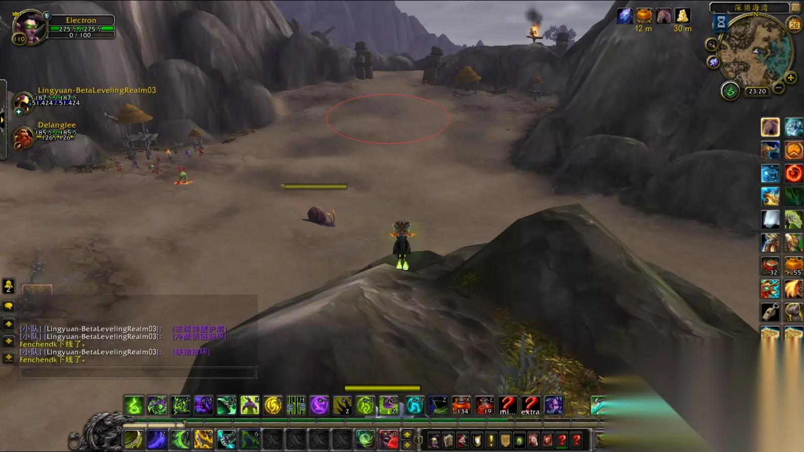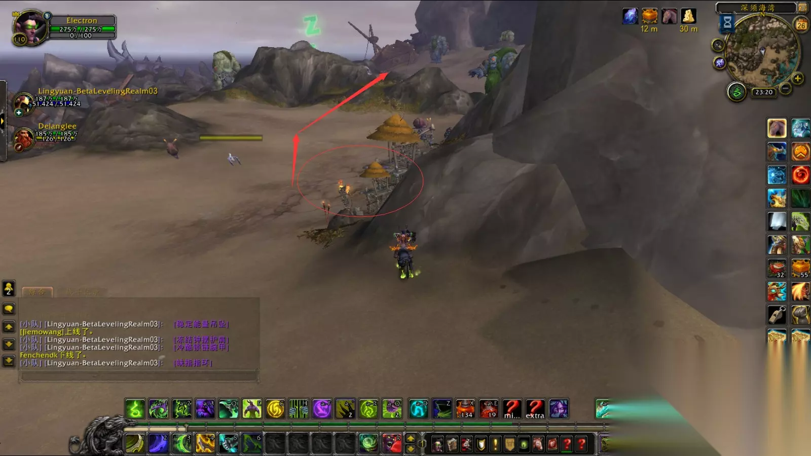 下面的图是击杀完最后一个奥术师的位置, 下面的图都是在击杀完之后再回来截的, 所以图中比较干净 清理完奥术师之后, 接着清理红圈区域内的小怪, 直到击杀BOSS范围内不会有ADD, 然后开始击杀BOSS 红圈内的小怪中间会有多群小螃蟹(非精英)的怪, 会给坦克挂减速同时伴随物理伤害的DOT, 如果没有办法解除移动限制, 可以让治疗提前去引下一波怪提升效率