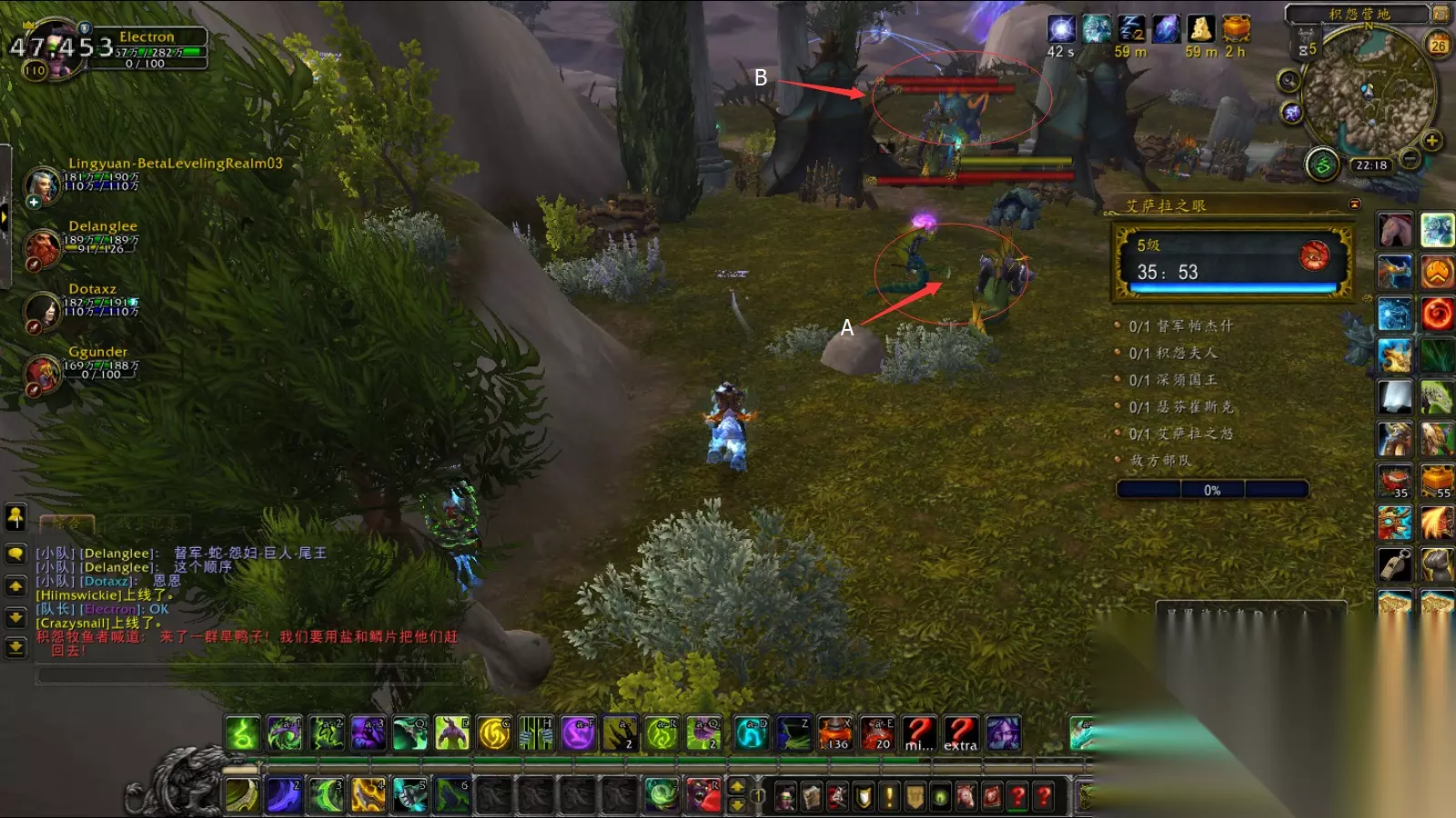 我们的击杀顺序是: 督军 -> 蛇 -> 女娜迦 -> 巨人 -> 艾萨拉之怒 这样的击杀顺序原因也只是因为(英勇/嗜血)的时间安排, 在我们的击杀顺序上, 1, 3, 5是有(英勇/嗜血)击杀的, 而蛇和巨人则是没有的, 原因会在BOSS介绍上详述 单体提下两种黄名小怪, 蜗牛和海鸥 蜗牛的读条攻击会给正面的玩家一个DEBUFF, 增加100%易伤 而海鸥则会瞬发给目标混乱4秒(失去仇恨) 所以在ADD到蜗牛的时候, 请躲开正面喷吐或者打断, 而在ADD到海鸥的时候要视情况优先击杀避免失去仇恨导致减员 另外, 在 蛇和巨人BOSS的场地范围内都存在海鸥, 如果队伍中有火法, 请注意很容易ADD, 视情况提前清理掉 进门: 由于要击杀很多小怪, 所以, 我们尽量把小怪的击杀时间放在(英勇/嗜血)的DEBUFF时间内, 所以在进门的时候, 我们选择尽量少击杀小怪 (在改过一次进门位置的小怪之后, 我们不得不击杀其中的一小部分) 进门之后靠左, A区域如果有控制则可控一只过, 没控制, 击杀两只, 然后击杀B区域 蛮兵和两只法系怪