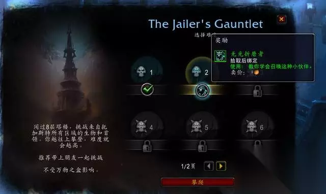 通关奖励,玩具、头衔、宠物和坐骑 “典狱长的挑战”只有八个难度,每个难度给予10个成就点和数量不等的橙装材料,但在第二、第四、第六和第八难度会有特殊奖励。 第二难度挑战完成,可以获得“无光折磨者”小宠物,就是旧版的小渊誓者。宠物的外观没什么亮点,就是换了个名字。