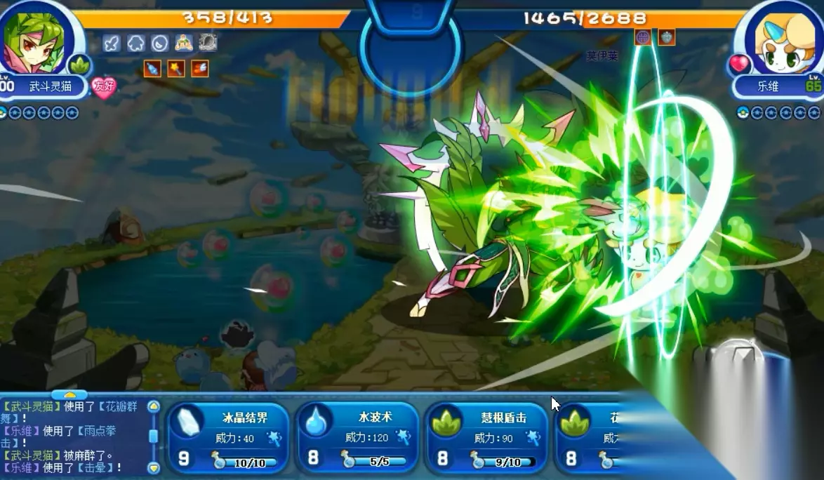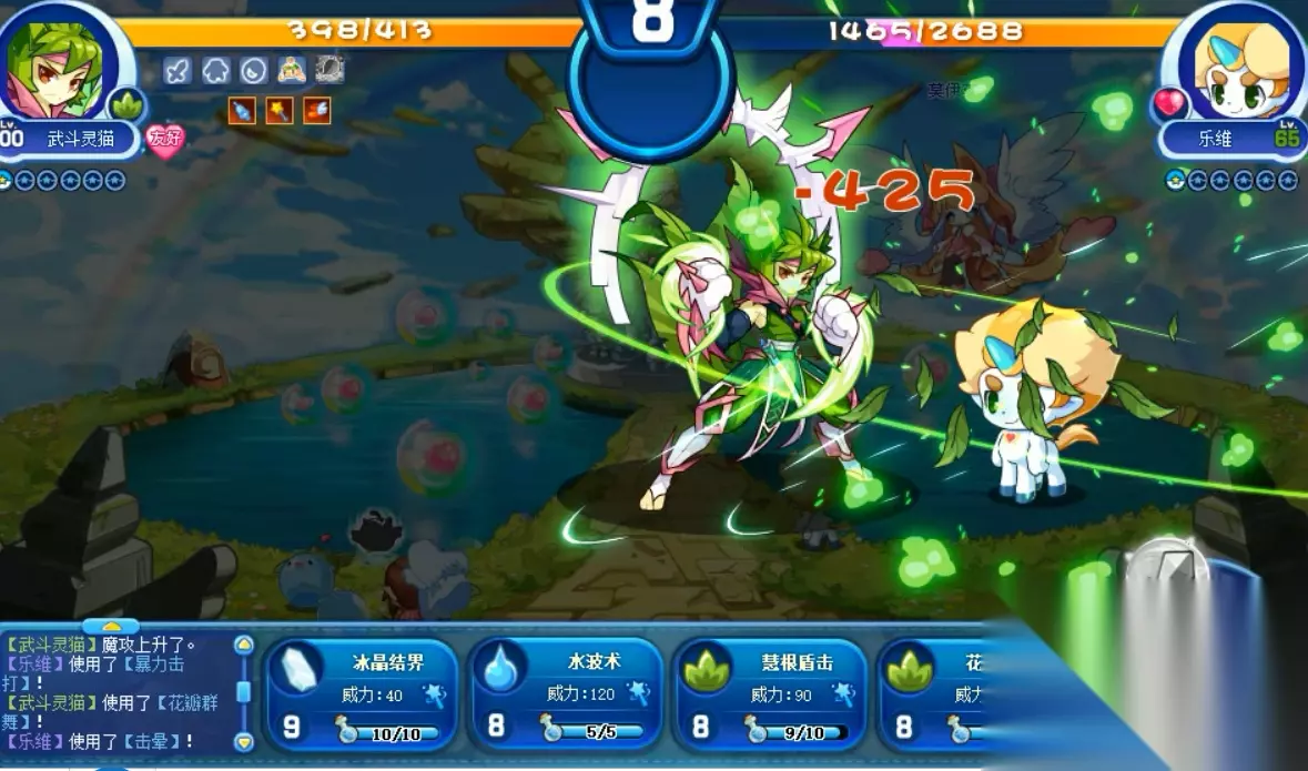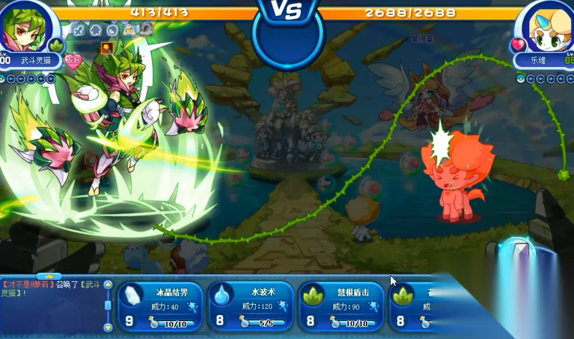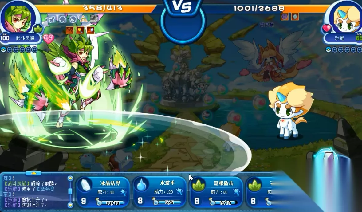 喵喵再次超进化的形象大图,名字为武斗灵猫,和之前的超进化武斗酷猫仅仅只相差了一个字,不过形象可是大不相同,感觉这次的喵喵不仅更帅了,而且变得更加强大了,技能方面也是极其的优秀。 不过可惜的是,武斗灵猫是物攻宠物,技能和种族都偏向物攻,一直走魔攻路线的喵喵竟然变为物攻的了,很奇怪。 武斗灵猫VS乐维。