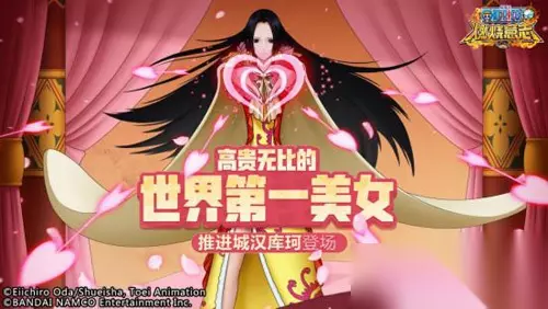武艺高强的海盗女帝 汉库珂在做奴隶时被迫吃下颓靡之果,因此她能将男女老幼尽数迷倒,并有将对方变成石头的能力。此前在游戏中已登场的SSR汉库珂具有高爆发的输出能力,同时也是群控的高手,而本次游戏内的SSR 推进城汉库珂,将以因佩尔地狱时期的造型再次登场,不论是技能强度还是属性都有了大幅度的提升。SSR 推进城汉库珂可以通过“颓靡之果”的天赋能力限制敌人的行动,以她的经典招式“芳香脚”对敌人造成大量伤害,使其陷入石化状态。除此之外,推进城汉库珂在充满爱意的八星特效加持下,完美还原汉库珂“世界第一绝世美女”的形象。 2月25日,推进城汉库珂在游戏中正式登场,这位兼顾美貌和实力的九蛇海盗团船长到底有多强呢?各位船长赶紧招募来看一看吧!在推进城汉库珂限时招募开启期间,游戏中会有大量福利活动陆续开启!豪华游戏道具等你来,请船长们千万不要错过这千载难逢的机会哦~