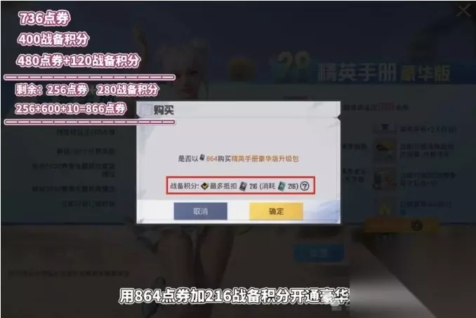 然后,我们再抽1块钱,用864点券加216战备积分开通豪华手册,同样也是立即返还1,080点券。
