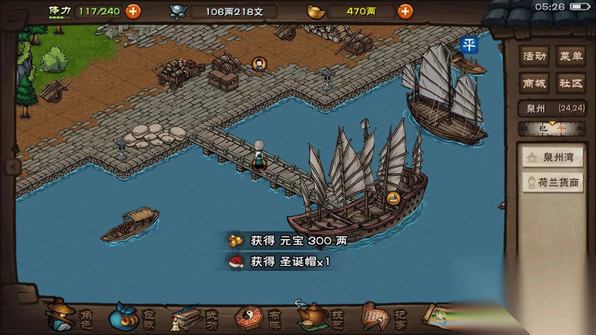 九只麋鹿抓齐之后去泉州的(24.24)找到泉州湾的荷兰货商提交就可以取得300元宝以及圣诞帽时装作为奖励。 之前注意过预告的玩家应该有提前准备捕兽夹,没有提前囤的也不太要紧,每天各地图杂货铺一共有8个,南阳和洛阳猎户家首次搜索各1个,实在不行还可以分两天做,完全来得及。