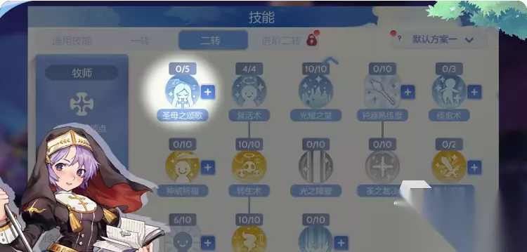 在二转之后,复活术,痊愈树,暗之障壁,洒水祈福都是必须加点的,如果在自己的配队的时候,物理职业占比更大的话,神威祈福,幸运之颂歌,都是要靠前去学习的。禅心作为进阶的二转技能,一定要加到5点,重要性比较高,但是优先度是比较低的,所以在二必须学习之后的再去学习。在初中期的时候光耀之堂是比较好用的,能够对多个队友进行回血,不过到后期就不好用了,在80级之前作用是比较明显的,先学这个,然后到后期的时候再将这个换成洗成光之障壁,这样能够将远距离攻击的防御增加。 在进行二转后,圣母之祈福是必须加点的,可以将双防提升,同时还可以将治疗量的冥想给提升。次要的技能可以选择沉默之术,PVP十分好用,还有天使之怒,可以将高伤害得到额外的加成,另外就是圣神殿堂,这个技能可以在短时间里面将伤害给免疫。神圣殿堂可以当下会必死的高伤害技能,一点就可以了,因为点高了会延长咏唱的时间的,蓝水可以选择,因为可以回复魔力。
