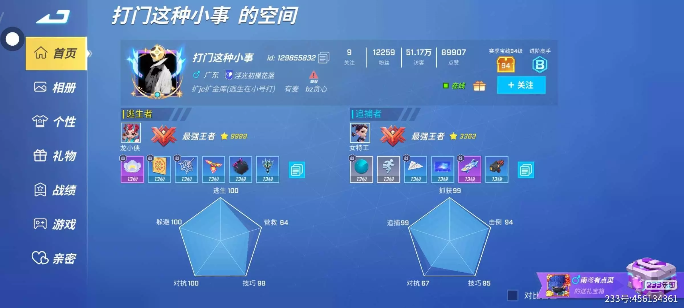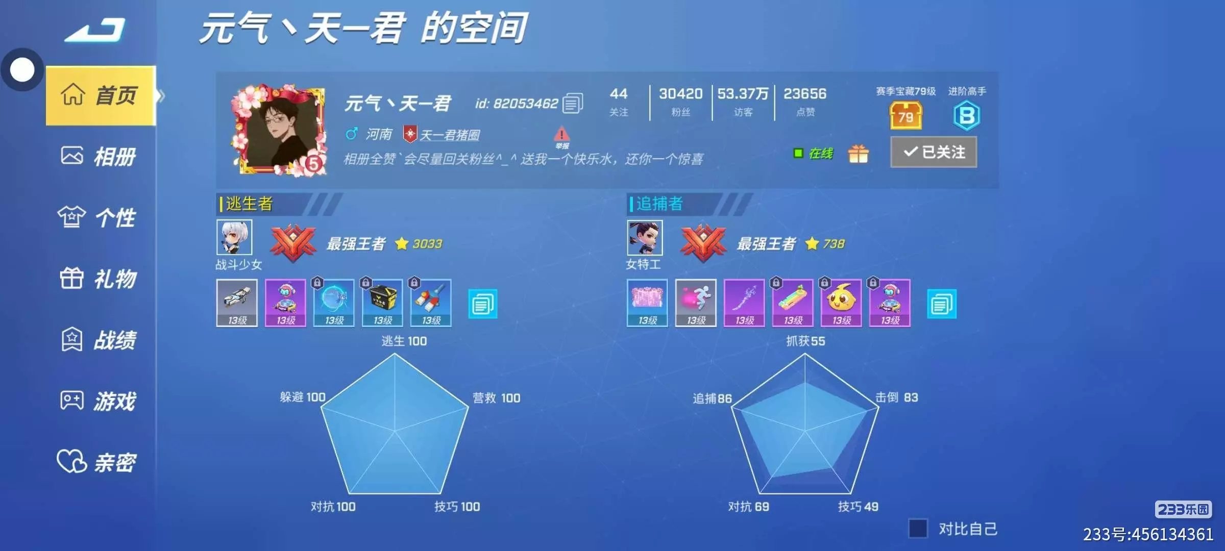 这两个人这么炸裂,图片一:一个逃生段位9999星和3000多星的追捕这个应该要打7年多但是个性值不高