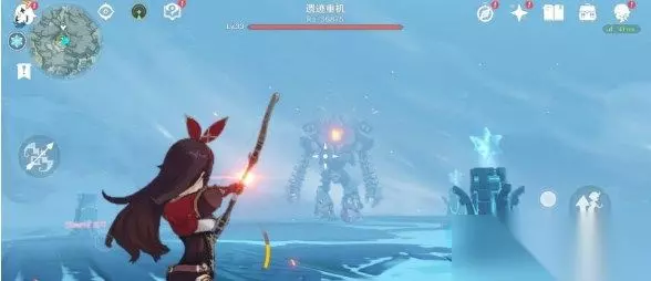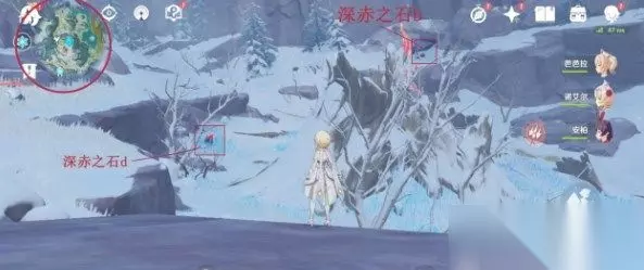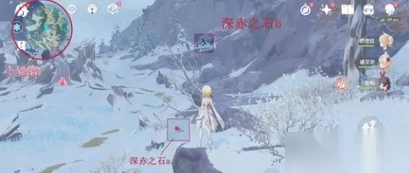 2、来到覆雪之路的锚点,在图中红框处看到2块深红的石头,分别打碎深赤之石,接着去击打中间的大冰块。