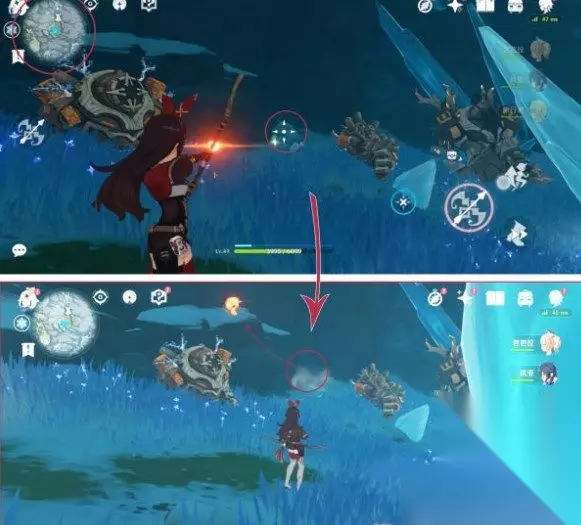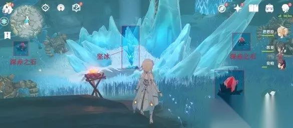 3、在左侧有丘丘霜铠王,旁边有第三个深赤之石,击碎深赤之石,拾取并攻击古代坚冰。