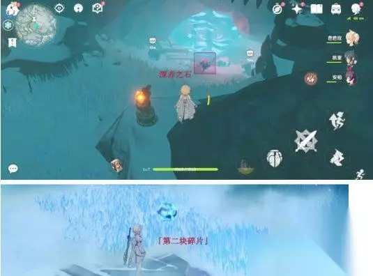 5、在坚冰后面的左边,击碎碎石堆,然后一直往前走,最后一个深赤之石和仙灵也在这里。将其分别击碎去击打坚冰,出现动画,第三个碎片也完成收集了。