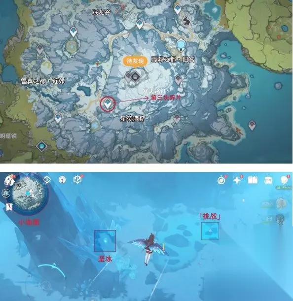 碎片三: 1、传送星荧洞窟锚点,进入洞窟,不断前进,在最深处可以看到一个挑战和坚冰。