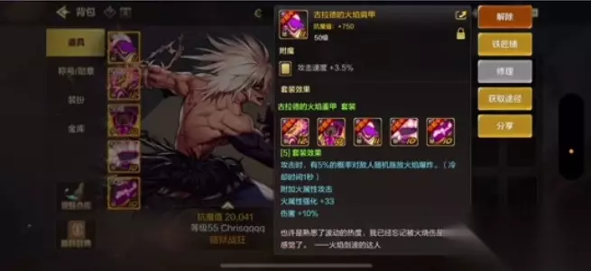 2.属性效果 「古拉德的火焰重甲」套装 【5】套装效果: ① 攻击时,有 5% 的概率对敌人随机施放火焰爆炸。(冷却时间1秒) ② 附加火属性攻击 ③ 火属性强化 +33 ④ 伤害 +10% 攻击灼伤敌人附加5%的伤害,并且自身火强也高,这种装备绝对是玩家们的好搭档! 一般都是红狗玩家会选择的套装,不过确实很适合红眼。