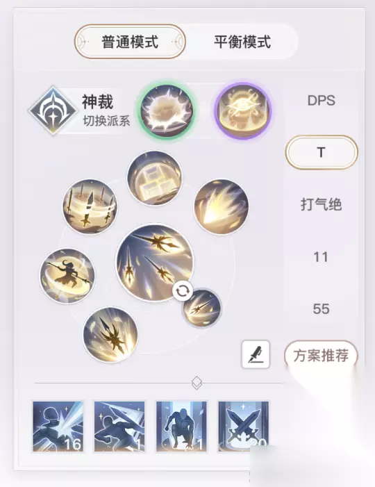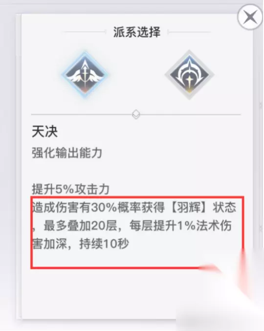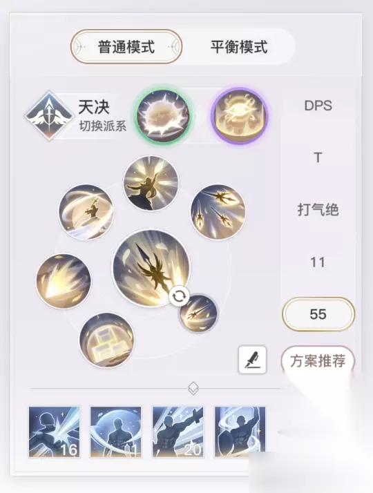 团战推荐使用天决派系,天赋第一行的穹光沐羽和第三行的光明信仰点满,第二行的神羽之佑点1点,能生效就行,剩余点数全部给第四行的誓战之道 誓羽打55和33的任务主要是打足控制,干扰对面后排,化身“搅屎棍”,不让对面后排正常输出,尽快攒出无双技能天羽辉耀,往人堆里放,天羽辉耀目前是天谕里面的最强团控技能,有着长达5秒的群体控制,多用几次天羽辉耀极有可能改变战局,对决天赋带御风而行,其效果是提升自身30%移动速度,可以极大地改善誓羽腿短的弊端,对决天赋如下图所示
