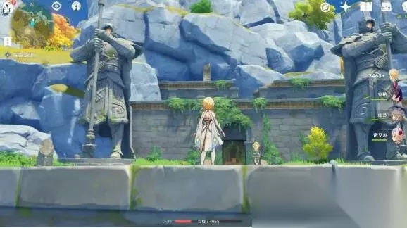 爬到石像上,放置两块石头