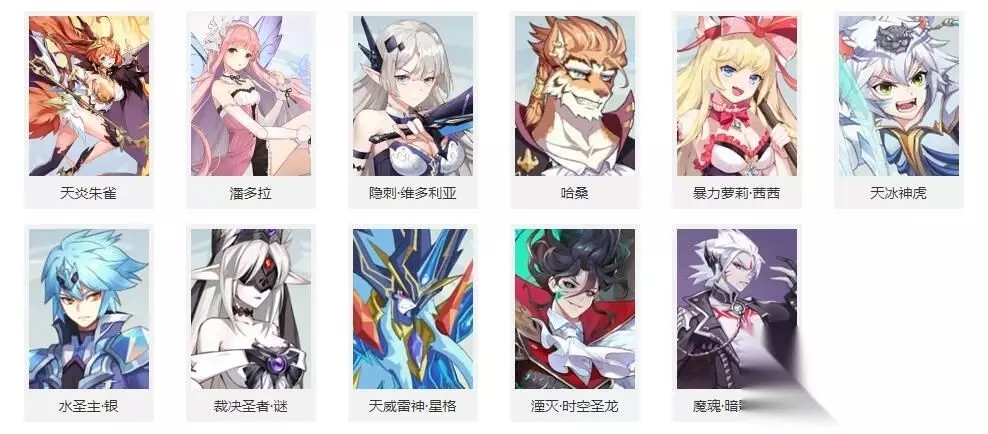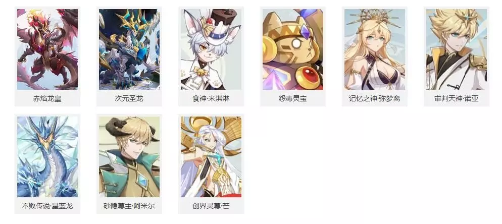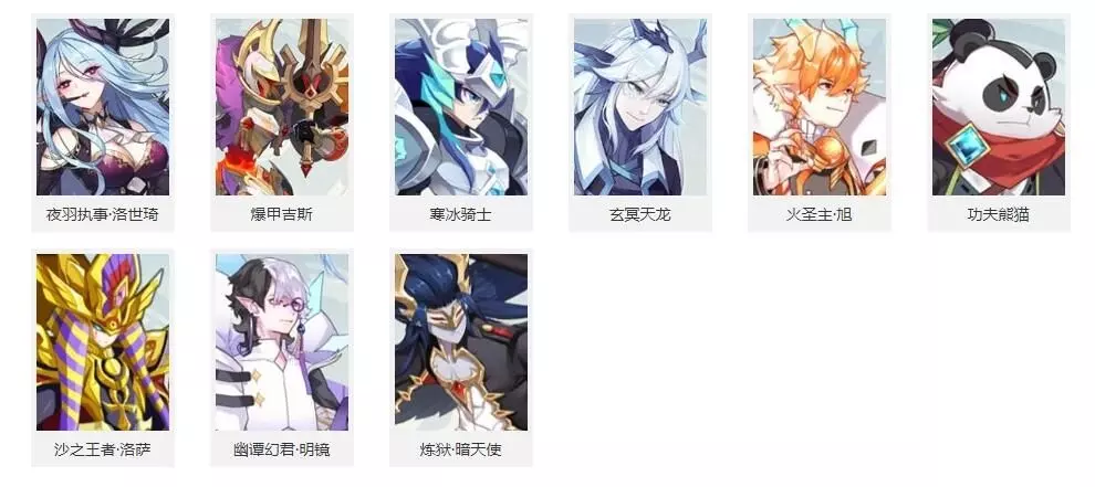 英雄精灵: 帝释天、龙炎、圣光飞龙、黯墨夜无忧、魄月炽辰光、光明圣麒麟、寒战空无流、无畏苍零式、烈阳龙君焰、圣翼光天使