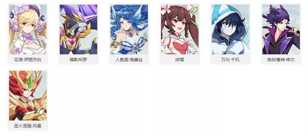 疾速精灵: 花语伊丽莎白、暗影所罗、人鱼姬海黛丝、绯樱、万化千机、炼狱魔神修尔、圣火涅槃凤凰