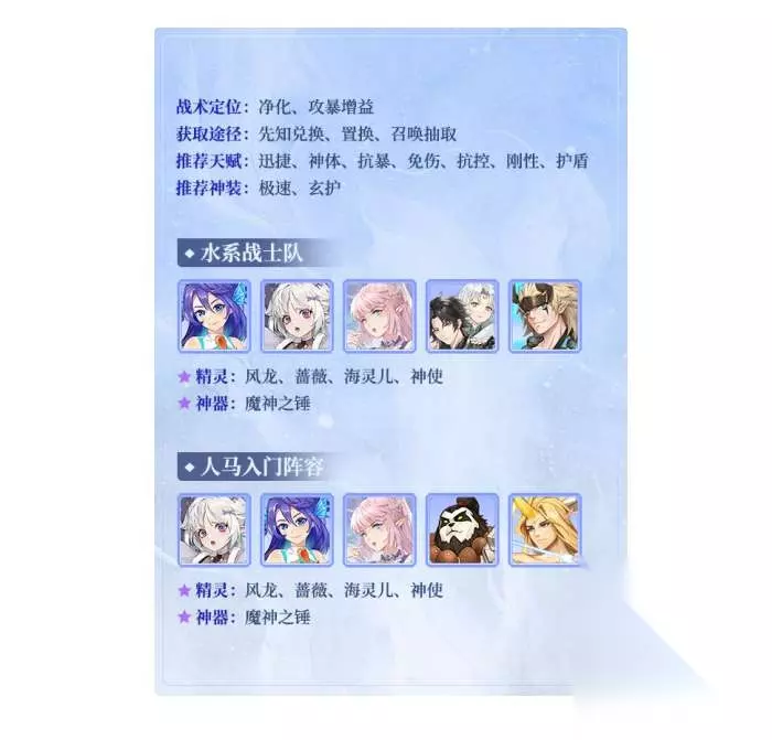 闪烁之光娜迦阵容 水系战士队 娜迦+佳瑶+塞壬+麒麟+须佐之男 ★精灵:风龙、蔷薇、海灵儿、神使神器:魔神之锤 人马入门阵容 佳瑶+娜迦+塞壬+熊猫+人马 ★精灵:风龙、蔷薇、海灵儿、神使★神器:魔神之锤 战术定位:净化、攻暴增益 获取途径:先知兑换、置换、召唤抽取 推荐天赋:迅捷、神体、抗暴、免伤、抗控、刚性、护盾推荐神装:极速、玄护