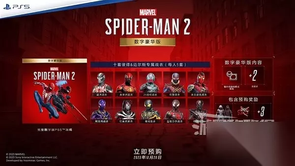 数字豪华版 游戏本体。 预购奖励全部内容。 10套独特战衣(彼得和迈尔斯各五套)。 额外的照片模式物品。 +2点技能点数。