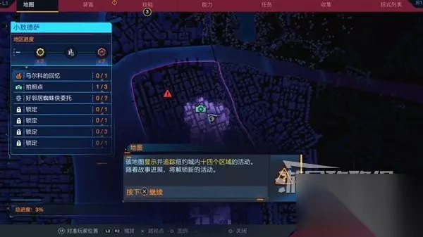 文章内容导航 探索指南 本作可以在纽约的十四个区域活动,随着故事的进展,可以解锁新的活动。包括:马尔科的记忆(沙晶)、拍照点、好邻居的蜘蛛侠委托等等。每个区域有三个等级奖励,一级和三级可以获得一些材料,二级则是解锁快速旅行。