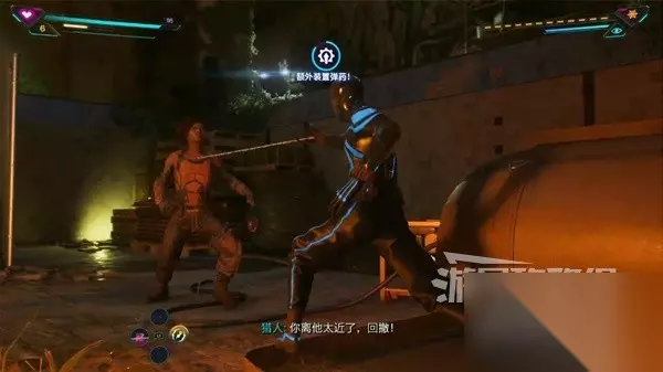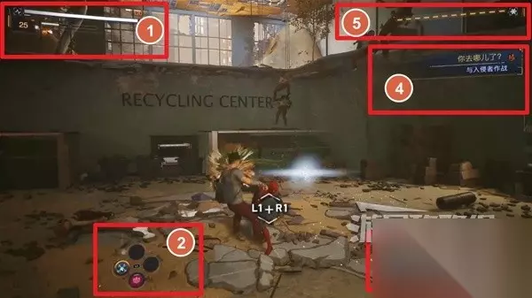 界面说明 1、白色为生命值,黄色为专注条,每次治疗或者使用终结技会消耗一格,通过攻击和闪避补充。 2、能力冷却状态,需要通过攻击和防御恢复。 3、装置冷却状态。 4、任务信息。 5、蛛丝子弹状态。
