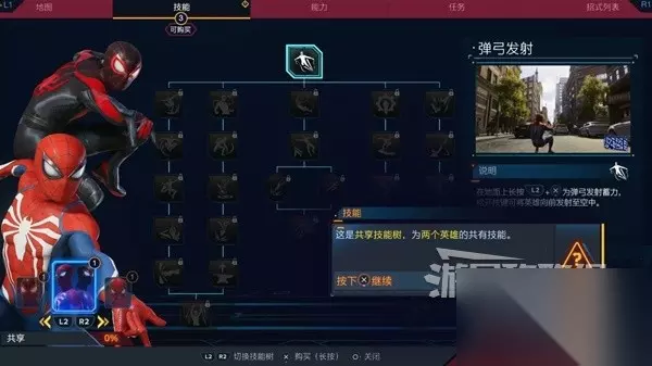 技能树 本作一共有3个技能树,分别为彼得·帕克技能树、迈尔斯技能树以及共用技能树。如果喜欢在空中战斗可以优先学习空中战斗相关技能,喜欢探索则可以学习蛛丝摆荡相关技能。完全根据自己需要的来就好,后期都是可以加满的。