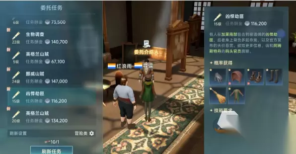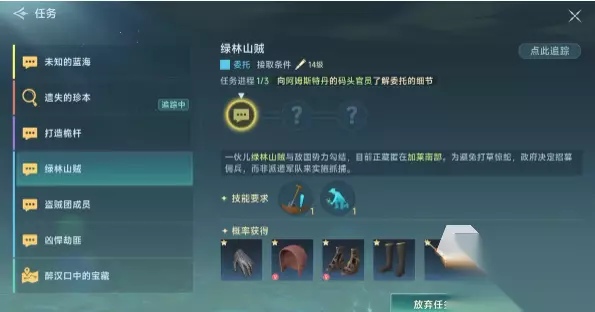 一、冒险任务介绍 在主城任务介绍人这里能看到,有战斗,商业,冒险任务可以接,如果想要刷某一系列的任务,就直接点击任务栏下面的小齿轮,里面就能看到当前鞥能刷的坐高任务等级,直接勾选想要刷的任务就可以,而这里主要就勾选冒险类的,接取的上限是24级,上限是可以通过组队来获得更高的上限的。任务界面右边可以查看任务的详情,比如目的地,目标,会掉落的物品装备之类的,技能要求,以及采集最低技能要求都是能看到的。在接取任务后,可以在任务列表看到该任务的流程,所有的冒险任务,在讨伐之前,一定要先去找码头官员兑换,之后再去对应地图战斗,能避免白跑一趟。