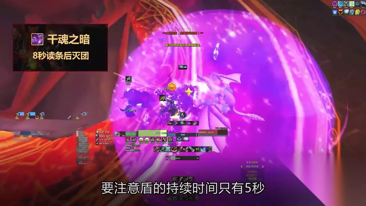 五千魂之暗鸡蛋标志性灭团技,8秒读条后秒全团,需要在BOSS读条时集中到一点。控龙选手开盾来撑过,要注意盾的持续时间只有5秒,得在千魂之暗读条快结束时再开,而且一条龙开两次盾之后就没了,DPS要抓紧打进下个阶段。当鸡蛋血量到55%进P4,从P2就开始有的护盾宝珠,从每次召两个变成召三个,再多加一个技能末日决战,不停地砸陨石一次三颗,5码范围的高额AOE,陨石在落地前有5到8秒的反应时间,类似术士地狱烈焰的动画,一定要及时躲开砸完再归位。P4同样需要控一条龙来撑过千魂之暗。鸡蛋血量到25%进P5,P5是软狂暴,BOSS不再召唤护盾宝珠,但继承其余技能,而且千魂之案释放频率加快,每20秒左右放一次。
