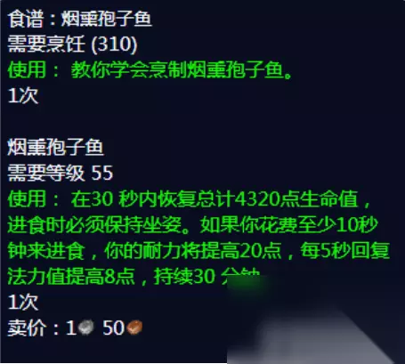 食谱获取方法介绍: 食谱:熏孢子鱼肉(Blackened Sporefish) 需要烹饪(310) 使用:教你如何烹饪熏孢子鱼肉! 需要等级55 使用:在30秒内恢复4320点体力,必须保持 坐姿。如果你花至少10秒钟食用它,你将获得 增加20点耐力和每5秒回复8点法力的效果,持 续30分钟 65级物品 需要赞加孢子鱼(Zangarian Sporefish)