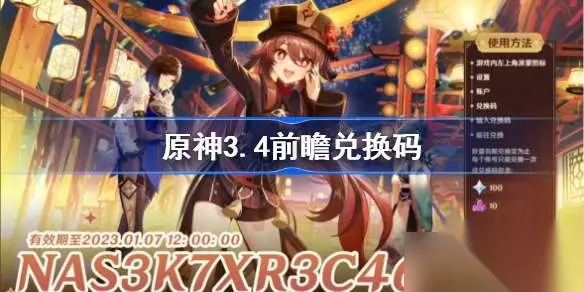 原神3.4前瞻兑换码有哪些 《原神》3.4版本「磬弦奏华夜」前瞻特别节目将于1月6日(本周五)晚20:00正式开启。 3.4版本【国服】前瞻直播兑换码,300原石哦! 第一个:NAS3K7XR3C46 第二个:PST33NFRKVPS 第三个:BTB227ERKDNW 有效期:即日起至2023.1.712:00:00 3.4版本内容 限定角色卡池上半艾尔海森+魈,下半夜兰+胡桃 五个活动磬弦奏华夜、演武传心、斗虫、蔷薇再开、精通移涌 海灯节自选四星角色9选1 两款新皮肤绫华、丽莎 新武器海哥专武-裁叶萃光