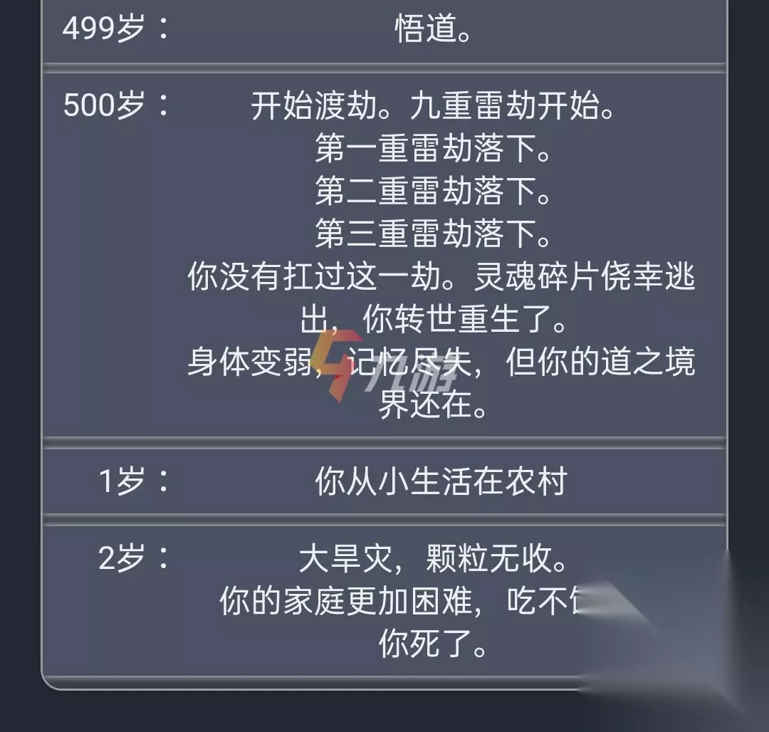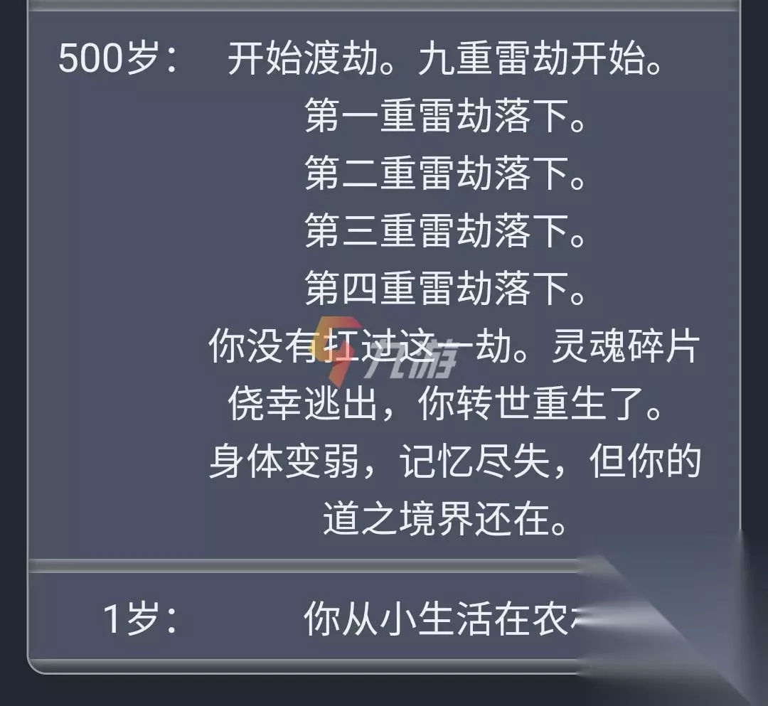 就比如,小伙伴们在修仙渡劫的时候,如果没有扛过其中一劫的话,就可以通过转世重修这个天赋来进行转世重生,同时一部分的属性也是可以得以保存下来。 不过需要提醒一下的是,这款人生重开模拟器本身是比较考验运气的,尽管有这个天赋存在,如果小伙伴们运气比较差的话,在转世重生的时候也会遇到如下这种比较尴尬的情况。