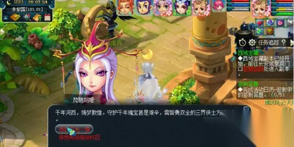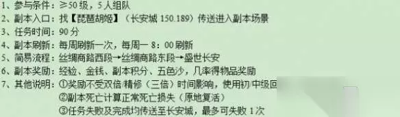 梦幻西游西域宝藏副本攻略 精灵问答 1、参与条件:≥50级,5人组队 2、副本入口:找【琵琶胡姬】(长安城 150.189)传送进入副本场景 3、任务时间:90分 4、副本刷新:每周刷新一次,每周-8:00 刷新 5、简易流程:丝绸商路西段一丝绸商路东段→盛世长安 6、副本奖励:经验、金钱、副本积分、五色沙,几率得物品奖励 7、其他说明: ①奖励不受双倍,精修(三倍)时间影响,使用初/中级回梦丹、回梦饮有效 ②副本死亡计算正常死亡损失(原地复活) ③任务失败及完成均传送至长安城,最多可失败1次