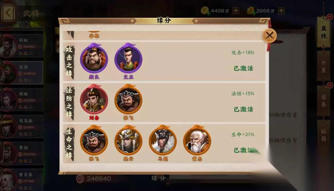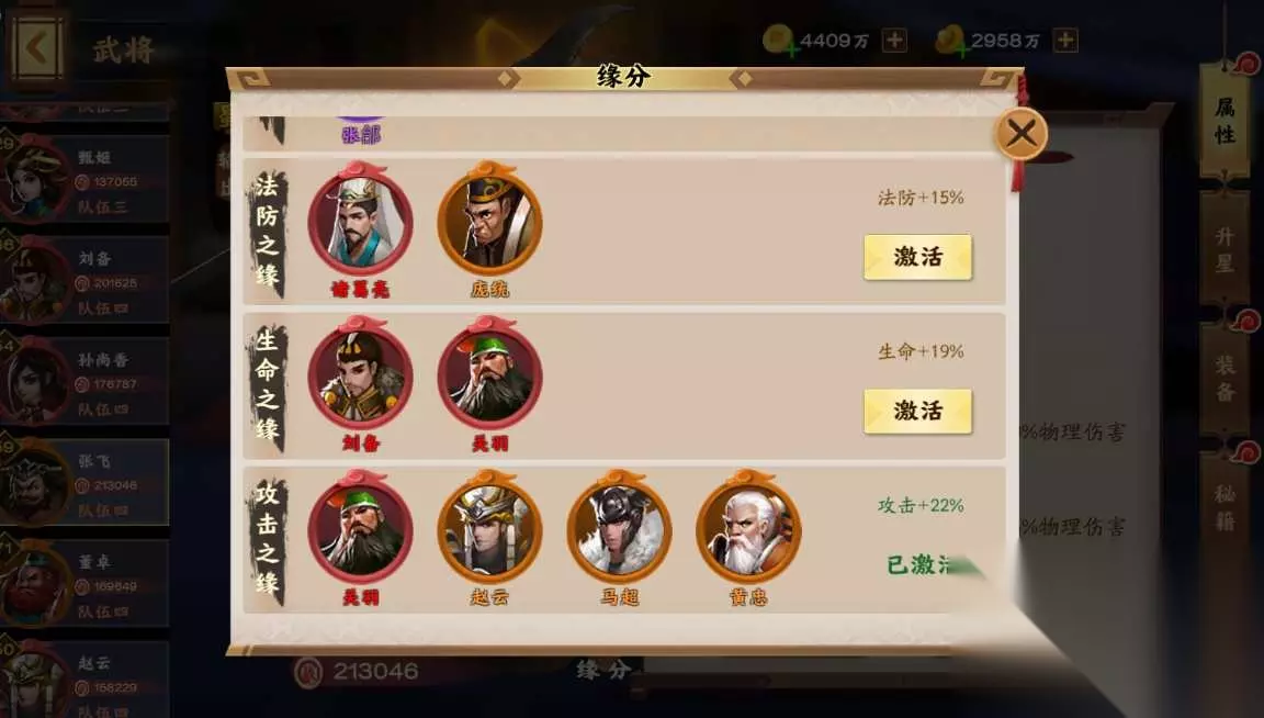 五虎上将阵容搭配: 想要组建这套阵容,我们需要拥有【关羽】、【张飞】、【赵云】、【马超】还有【黄忠】这5位武将,这五位一同上阵的话就能够激活五虎上将的缘分羁绊,其中张飞、赵云以及黄忠这三位是攻击属性加成,关羽是生命属性加成,马超则是物防属性加成。