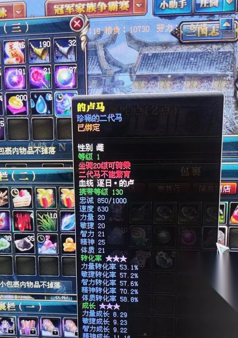 御龙在天手游坐骑系统如何?御龙在天手游中怎样获得坐骑?今天要为大家讲一讲御龙在天手游的马匹是怎么获得的及如何繁育。作为国战类手游,没有一个代步工具会被累死,有马走遍天下,不是白说的。 马匹的获得与繁育 玩家可通过主线任务、马场、副本或者寄售获得马牌,使用马牌可以获得马匹,随着玩家等级的提升,马槽的数目也会增多。在获得的马匹中,马的种类以及品质也是不同,马匹的属性也会根据马匹品质的颜色有所差距,品质由高到低依次是紫色、绿色、蓝色、黄色以及白色。将更为优秀的马置于备战状态,会极大提高玩家的战斗力。同时,玩家可以在王城坐骑接引处进行坐骑的繁育,将一代马繁育成属性更为优良的二代马匹。