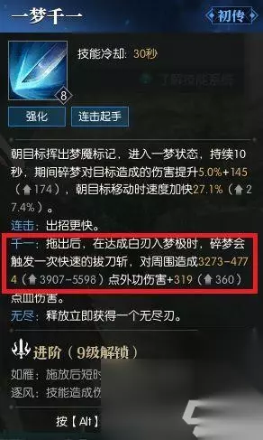 至于要怎么触发一梦千一,请练习技能回圈,你会发现碎梦技能施放后,都会闪黄框,这时在接下一个技能便会累积【白刃入梦极】,必须不中断5次即可触发。