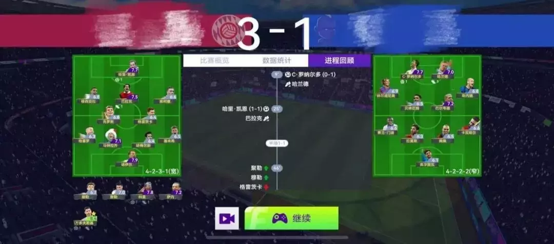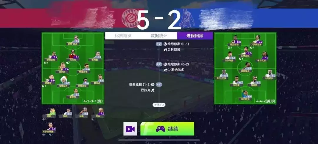 下面两场比赛都是在对方的球队阵容强于自己并且先丢球的情况下通过临场调整最终艰难逆转取得胜利的!因为这两场我没有截战术的图,所以我就简要给大家分析一下: