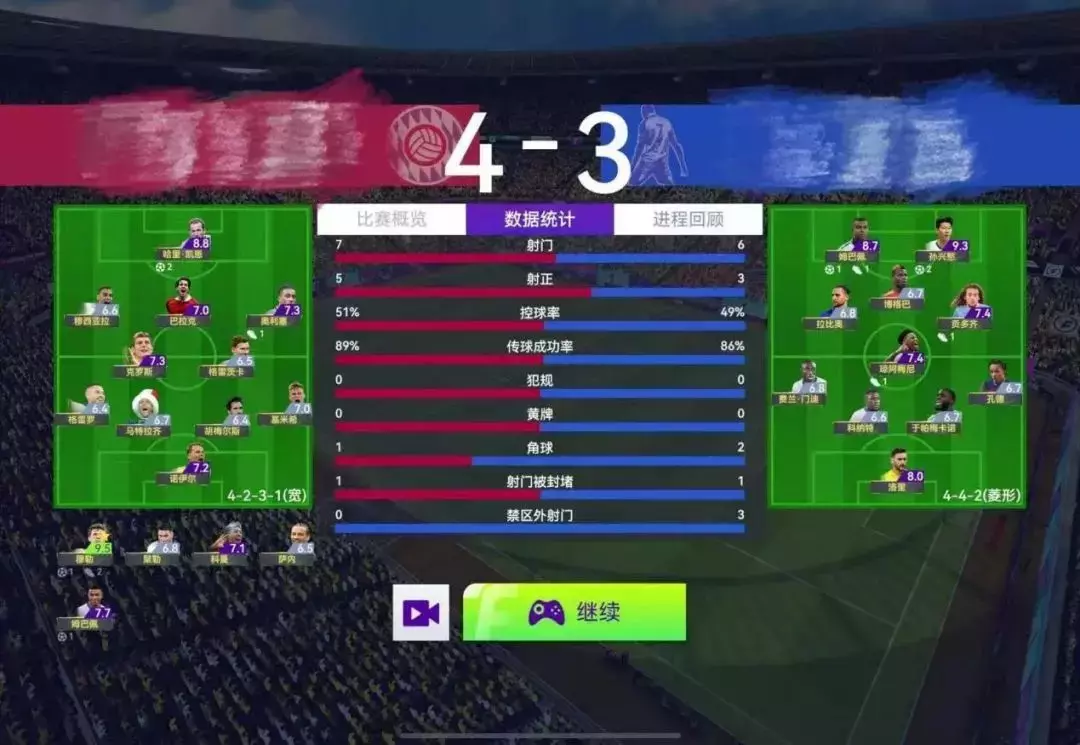 可以看出双方的控球率几乎是55开,射门次数也相差无几,毫不偏袒地说这场胜利就是更高的评分和更好的球员带来的优势,但更重要的是若没有认真分析且及时、大胆地临场调整,这场比赛有很大概率是不能全取三分,甚至有可能赢不了的,所以我才敢说在经理人天梯中“足球是圆的”嘛~哪怕相差100~200分,稍有不慎就容易翻车,又有谁敢说能稳赢对面呢?