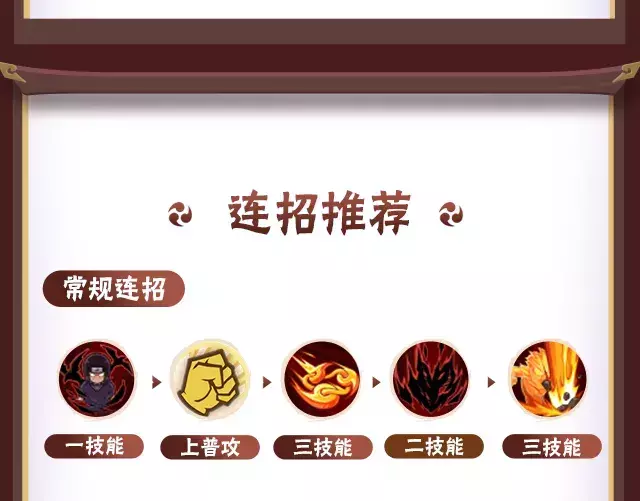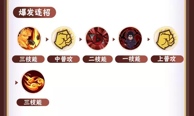 瞳力充盈时释放三技能须佐能乎摸奖起手,命中敌人后,打出中普攻4A接二技能爆发黑炎输出高额伤害,紧接着释放一技能用幻术控制敌人,随后上普攻4A连段接三技能扔出勾玉抓取敌人,造成伤害的同时恢复瞳力。