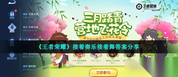 《王者荣耀》营地飞花令答题活动目前不少小伙伴都前往参与了,其中一道谜题的内容是:接着奏乐接着舞,那么这里说的是哪位英雄呢?可能部分玩家还不清楚,接下来233乐园小编就给大家整理了《王者荣耀》接着奏乐接着舞答案分享,一起看看吧。 《王者荣耀》三月踏青营地飞花令活动题目及答案大全:点击查看