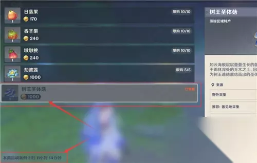 总而言之,树王圣体菇目前可以在两个须弥NPC这里购买,价格都是1000摩拉一个,商店左下角有个刷新时间,最好留意一下,等刷新后再来买。