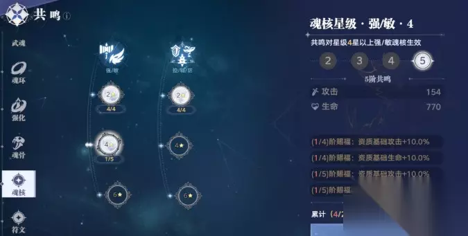 魂核共鸣:必须明确一点:不管强敏攻还是辅助控制两大类的魂核共鸣,前期毕业条件都是惊人的20个4星魂核!(最终是20件6星魂核)这注定是一场持久战。 大家不妨看看,目前能凑齐一套24星魂核都已经是不少人的终极追求了,更何况是20件4星?6星?虽然这条路很远,但终点奖励也无比丰厚——点满的共鸣属性加成,绝对是质变级的提升! 符文共鸣:这套共鸣是最近新上的,从属性来看加的都是好属性,但是现在符文除了氪佬有很多金色的,普通人应该没几个,更别说是否是刚需的金色了,所以这条路也很漫长,慢慢获取吧。因为对比之下,这套共鸣加的属性最多。