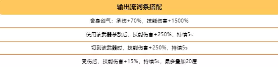 词条可选择以下四个,首先唯一选择舍身剑气:承伤+70%,技能伤害+1500%,之后可选择使用该武器杀敌后,技能伤害+250%,持续5s。还有切到该武器时,技能伤害+250%,持续5s。最后选择受伤后,技能伤害+15%,持续5s,最多叠加20层。这四个词条选择后,前期只需要用末日裁决就可以轻松打掉血肉屏障。