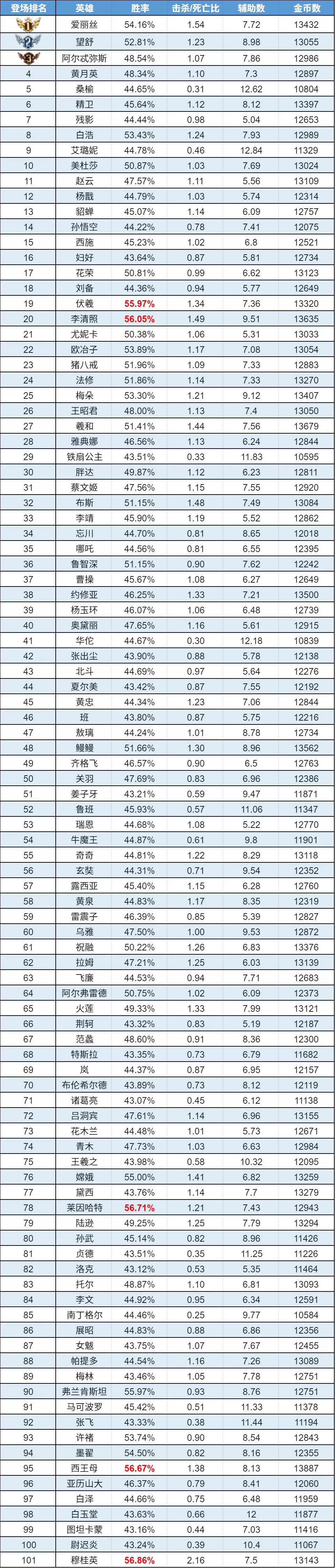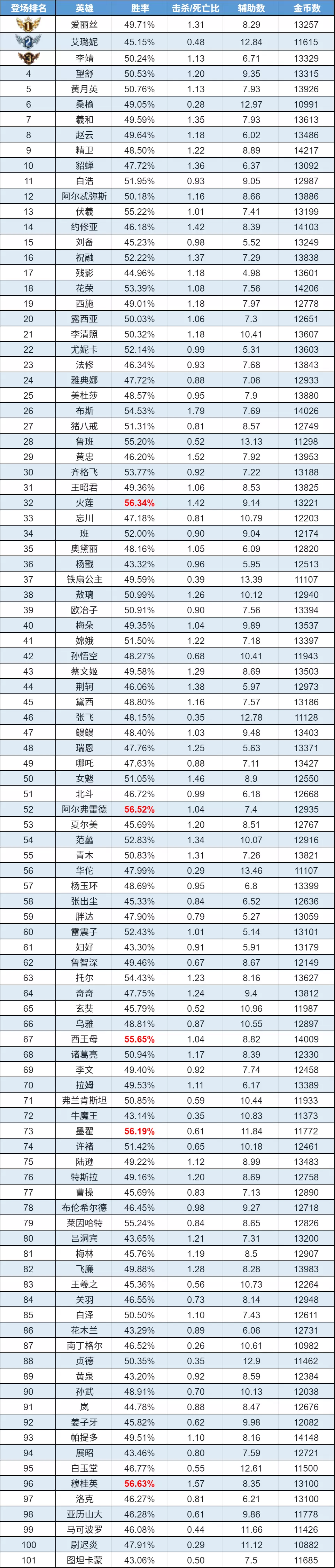 排序:按登场率高低排序,标红为胜率前5