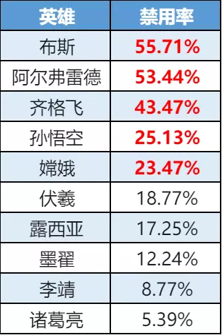 禁用率榜-诸葛亮仇恨值up,露西亚排名稍降