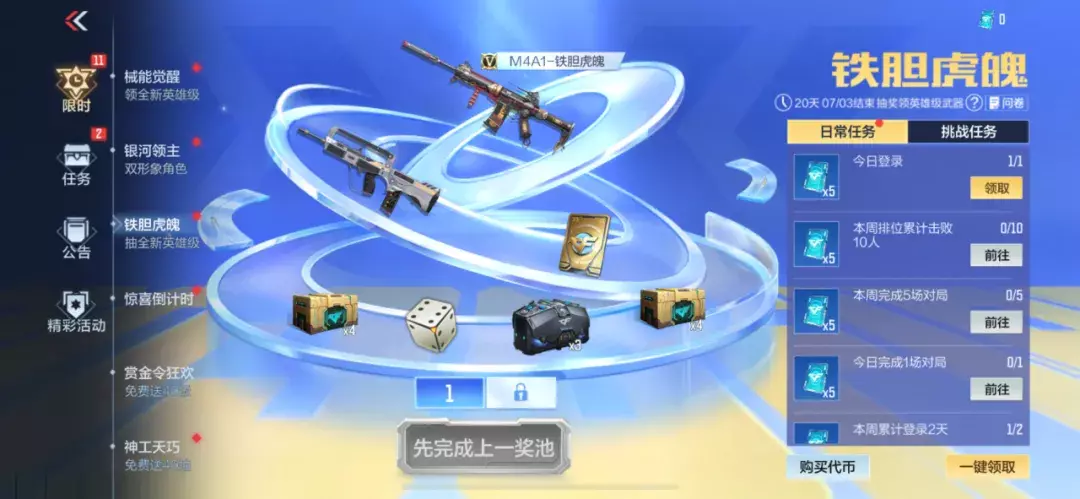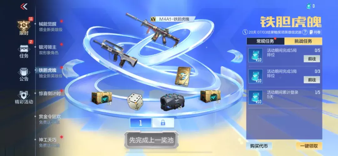 但同时增加了钻石购买抽奖币的功能,玩家亦可以花费钻石来加速,提前拿到M4A1-铁胆虎魄!