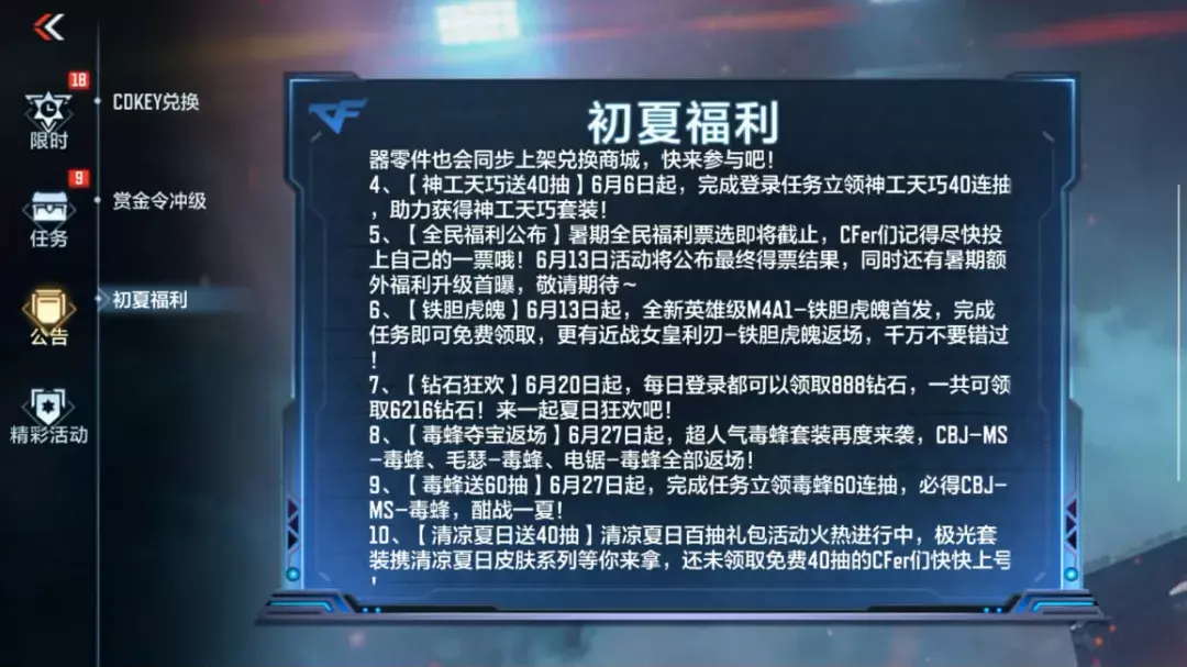 该活动已经于6月13日开启,并会在7月3日结束,活动整体十分轻量,CFer们只需进行对局完成任务即可领取丰厚的抽奖代币,把奖池内的奖品统统带回家!一号奖池核心奖励为返场武器女皇利刃-铁胆虎魄,另外还有其它次要奖励旧兵工厂十连抽券、王者之骰、虫之秘觉醒宝箱、50钻石宝箱和樱挑战卡等。