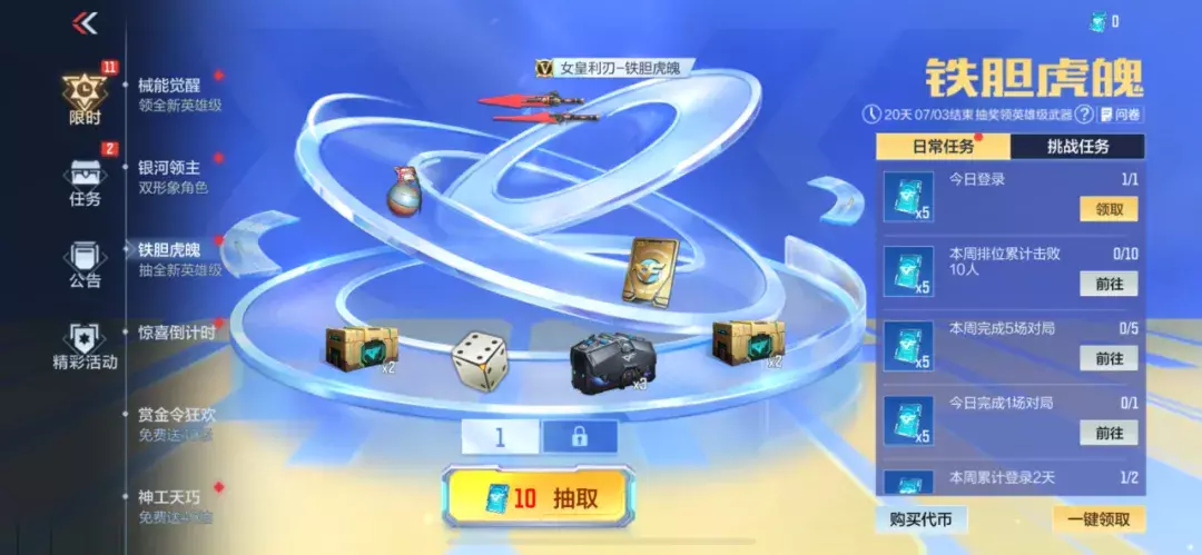 该活动中,玩家完成相应任务即可获得对应数量的挑战币,分为每日、每周和挑战任务。每日每周任务都会在固定时间刷新,其中每日任务为登录和完成1场对局获取,每周任务为登录2日、完成4场对局、击杀10人和暴击5次。